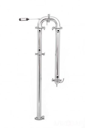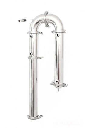 Из каких конструктивных элементов состоит самогонный аппарат колонного типа? Это перегонный куб (бак, емкость), который имеет конструктивное соединение и куда крепиться колонна 1,5, 2, 3 или 4 дюйма. Сама колонна в сборе содержит одну или несколько царг, дефлегматор (обычно кожухотрубный), отвод на 90 градусов со штуцером под термометр, а также отвод без штуцера, холодильник, носик для сбора дистиллята. Обычно такой комплект включает шланги для подключения холодной воды, термометр один или два, спиртомер бытовой, штуцеры (могут не быть).
