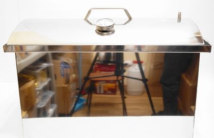 Например, такая коптильня средних размеров с толщиной металла 1,5мм имеет поддон для жира с ручкой, две решетки, куда укладываются продукты и крышка со штуцером. Крышки могут быть в форме домика и полукруглые. Коптильни могут комплектоваться электронным или биметаллическим термометром. Коптильни могут быть и в вертикальном исполнении.
