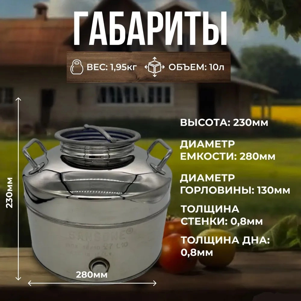 Бидон из нержавейки объемом 30 л предназначен для длительного хранения пищевых и непищевых продуктов. Может использоваться в качестве перегонного куба для самогонного аппарата или в качестве емкости для брожения.